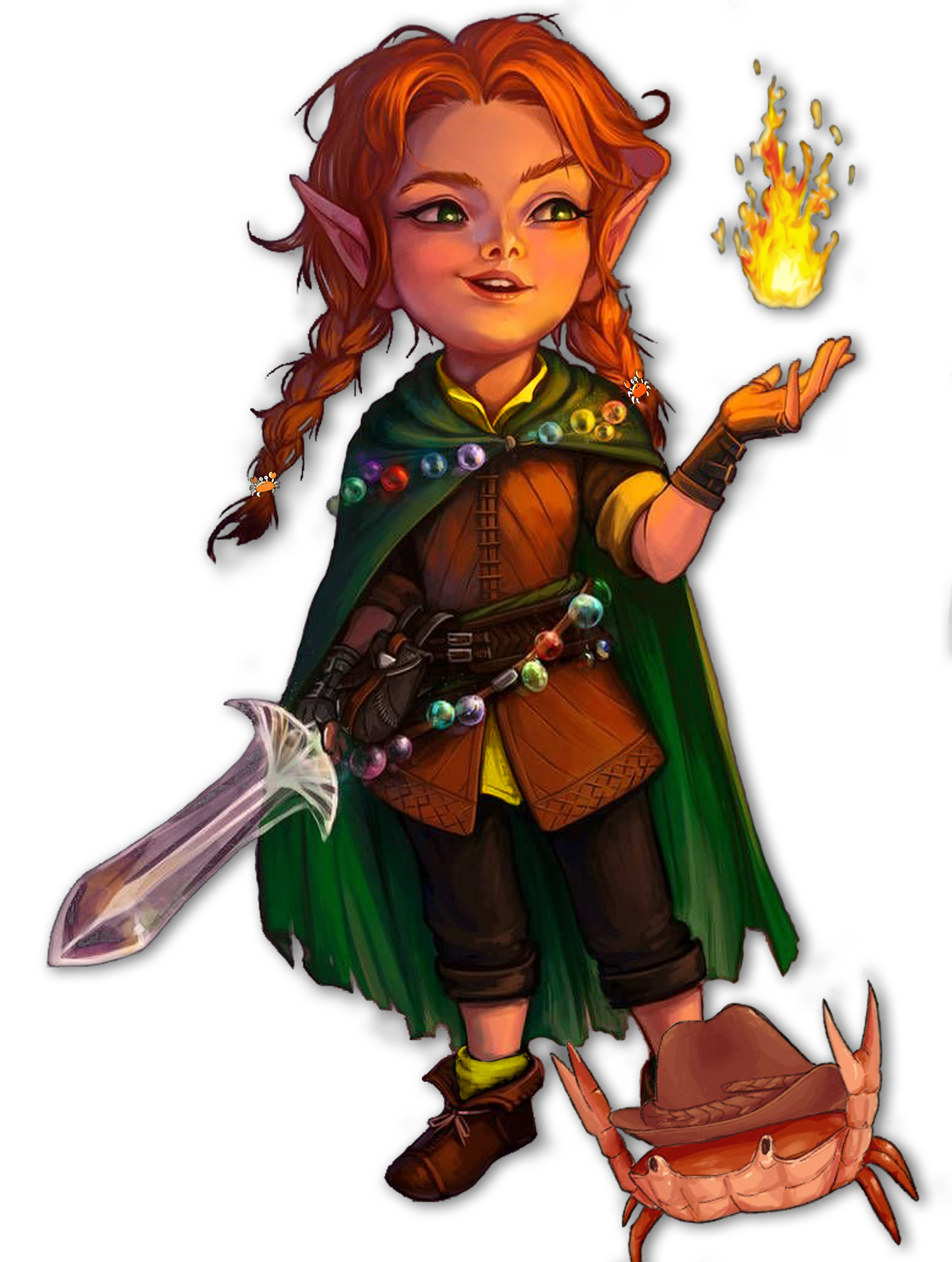 Сопровождается крабом-фамилиаром Цок-Цоком, который благодаря своей степенности и благоразумию несколько повышает шансы на выживание Шелли и окружающих.